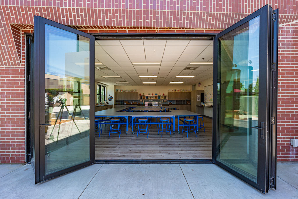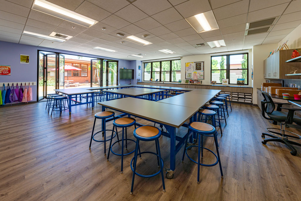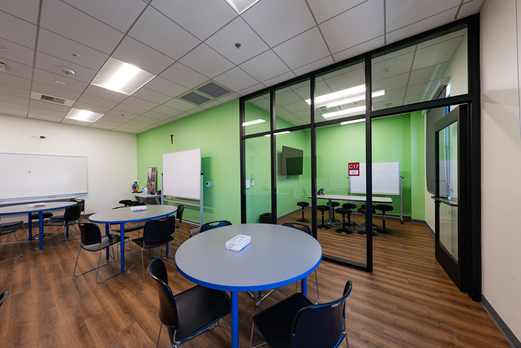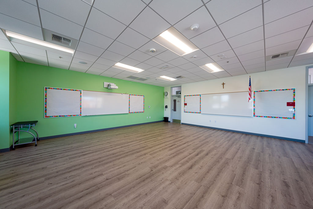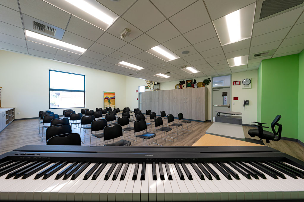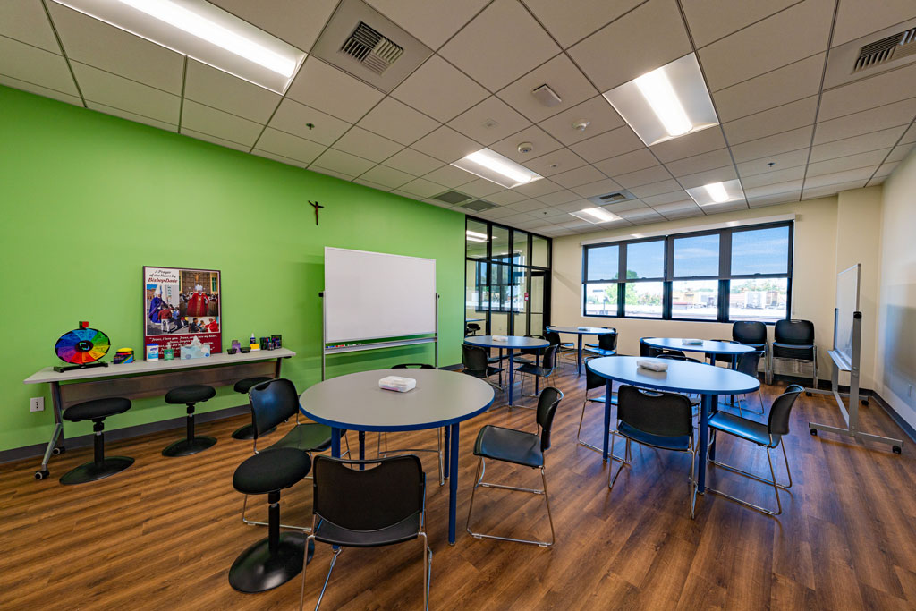 The space also includes a meeting room, teachers’ lounge and office spaces for administrators as well as restrooms on each floor for students and staff.