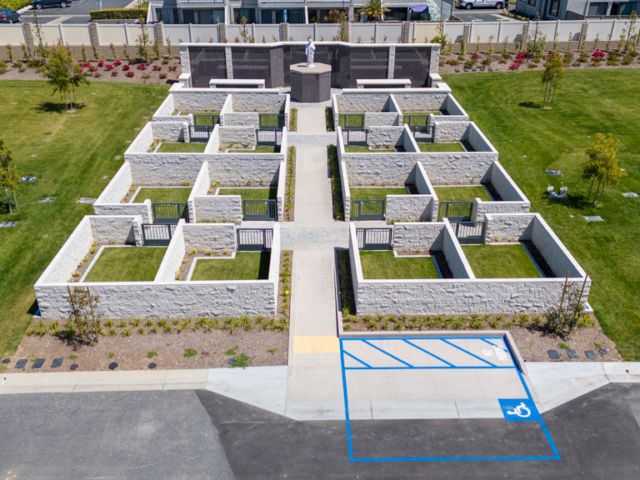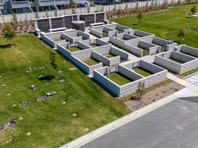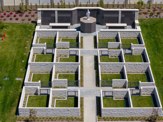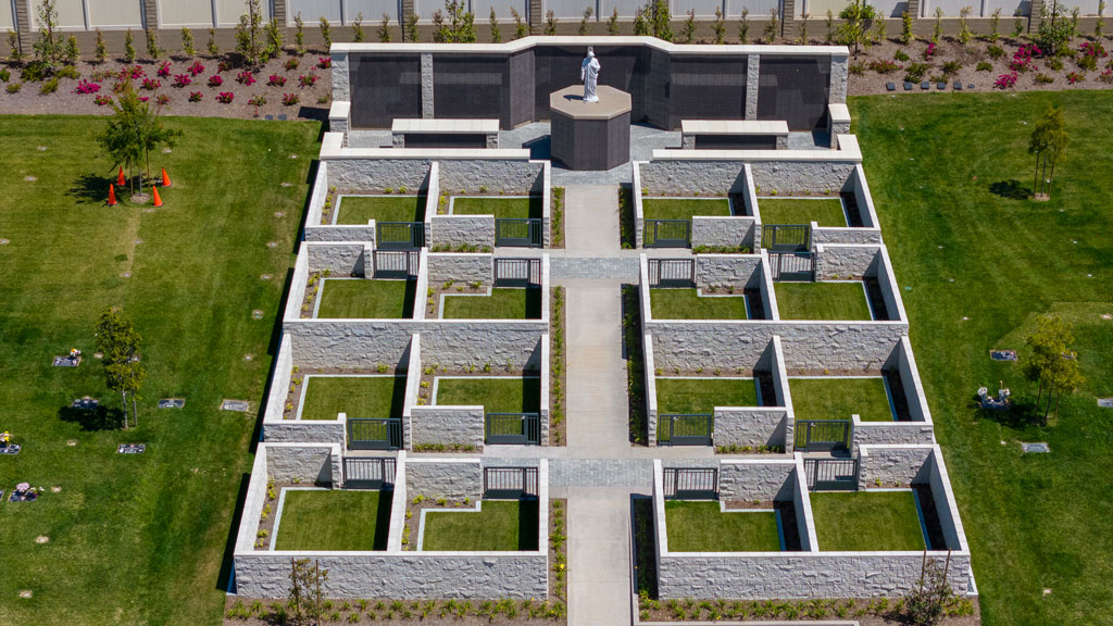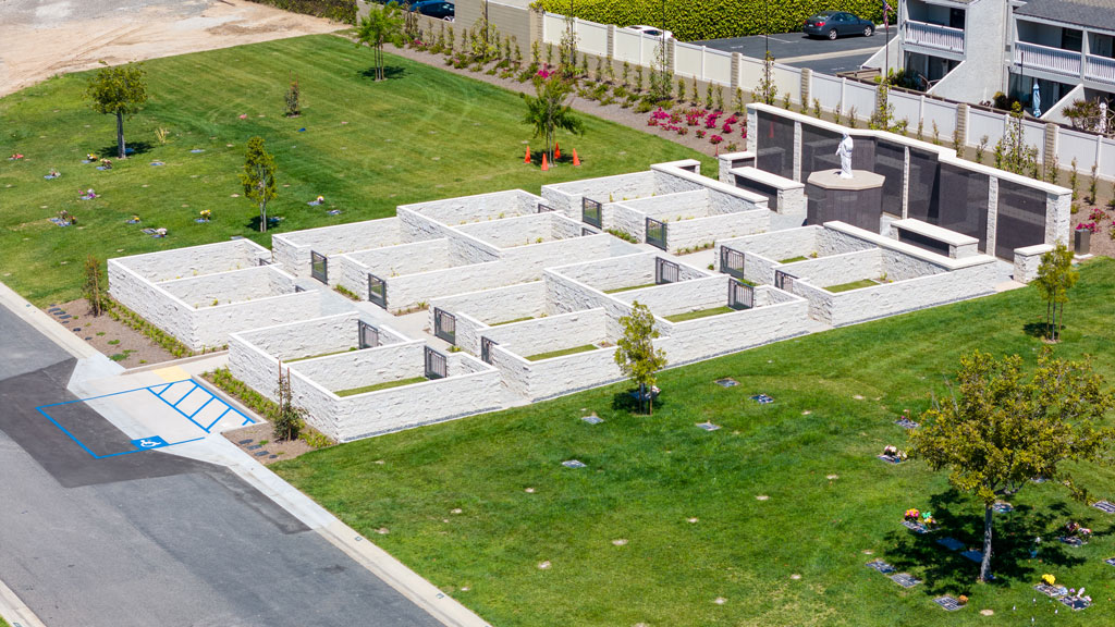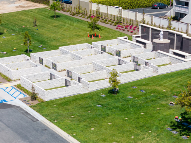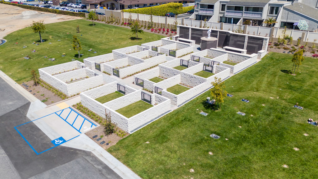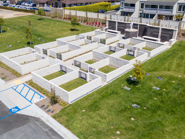 - 16 new family burial plots with 8 crypts per plot. Custom white CMU block walls and metal gates with engravable plaques for family name. Crypt lids are 4 pieces here compared to single large slab lids in the rest of the cemetery due to access restrictions for the heavy equipment needed to move the slab lids.