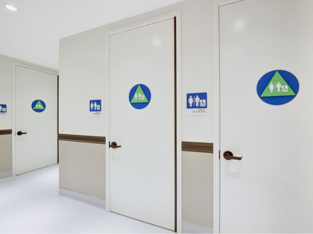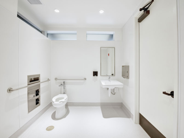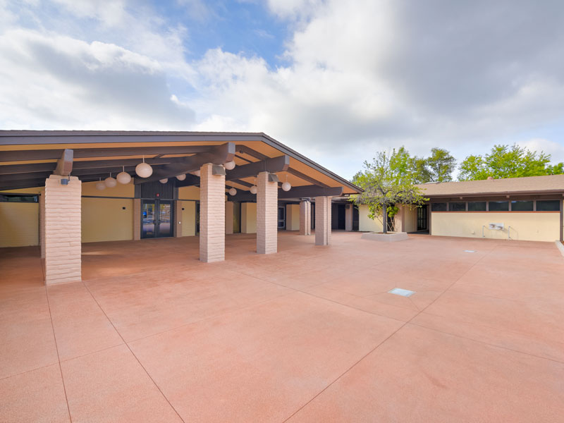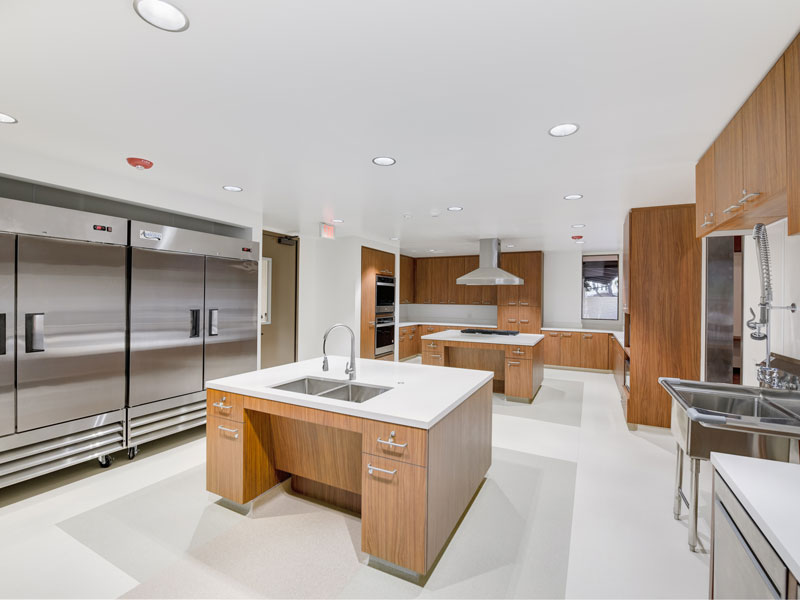 Work includes new single occupancy restrooms and shower, teaching kitchen and staff kitchenette, floors, wall and ceiling finishes, lighting throughout, gutters at roof edge, parking lot restriping, new accessible path from the south courtyard to the public realm, infill of existing pool and covering with new paving, electrical and communication devices.