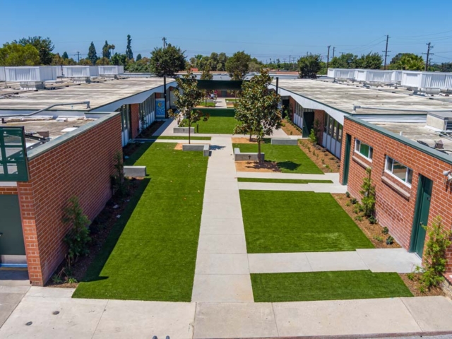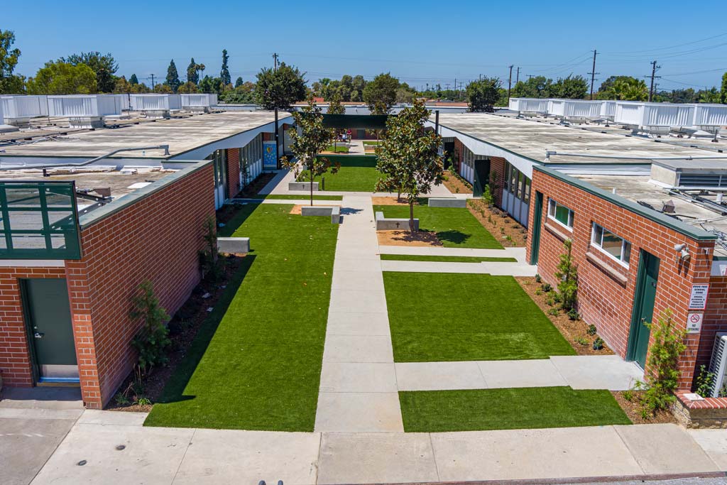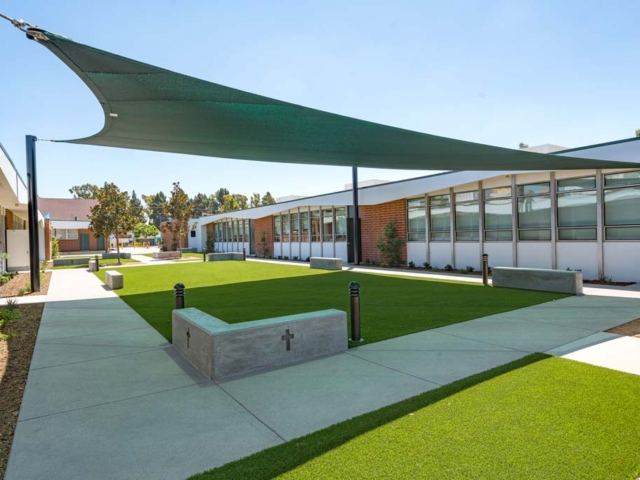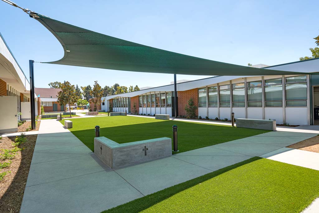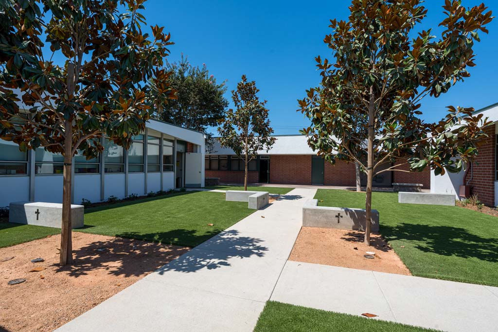 The exterior of the campus buildings was power washed, stucco repaired and received a fresh painting scheme. A common area courtyard was built out with a dozen poured in place concrete seat walls, artificial turf, decomposed granite, Magnolia trees, low maintenance landscaping, and a large shade sail for the students to utilize as an outdoor workspace. A new 80-foot-long screen with welcoming signage will direct families to the new receptionist and office areas.