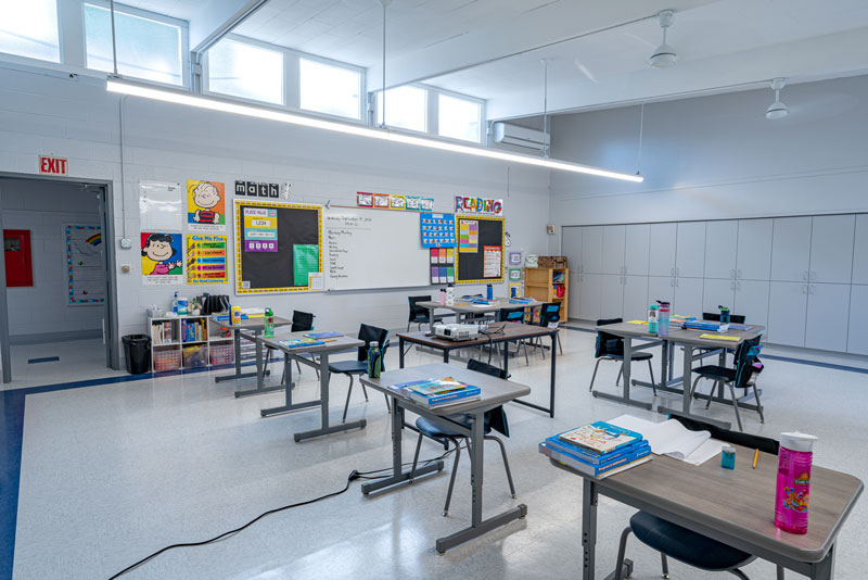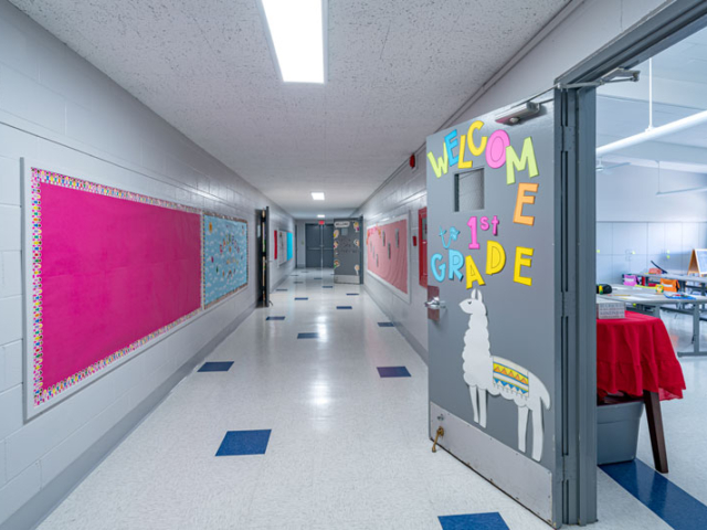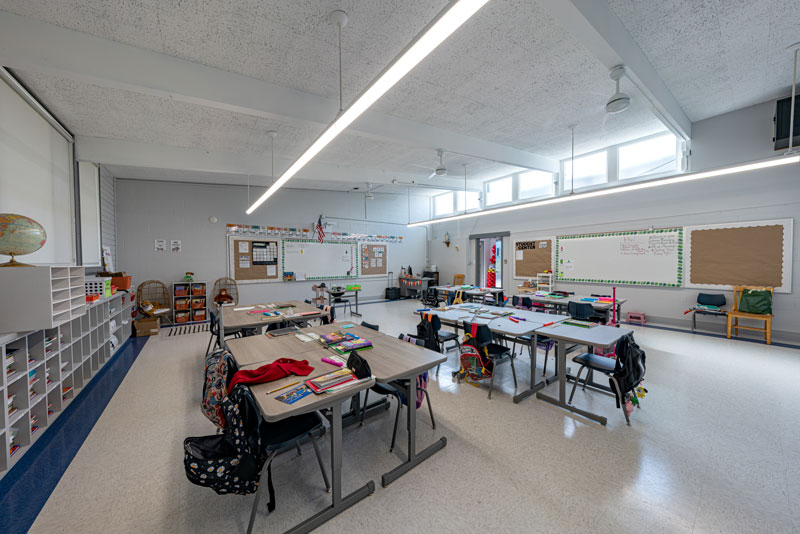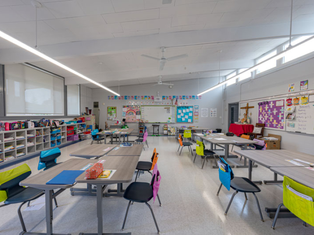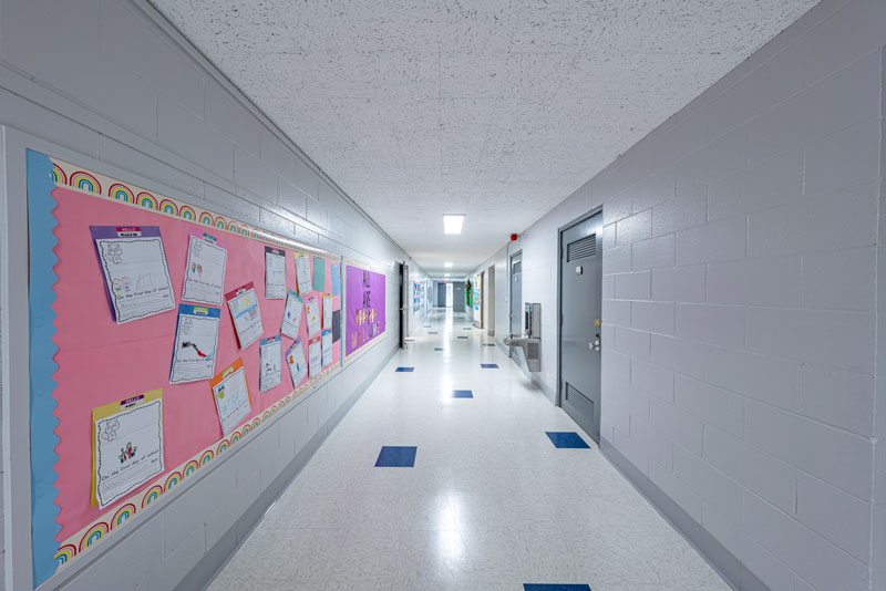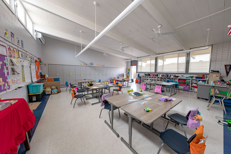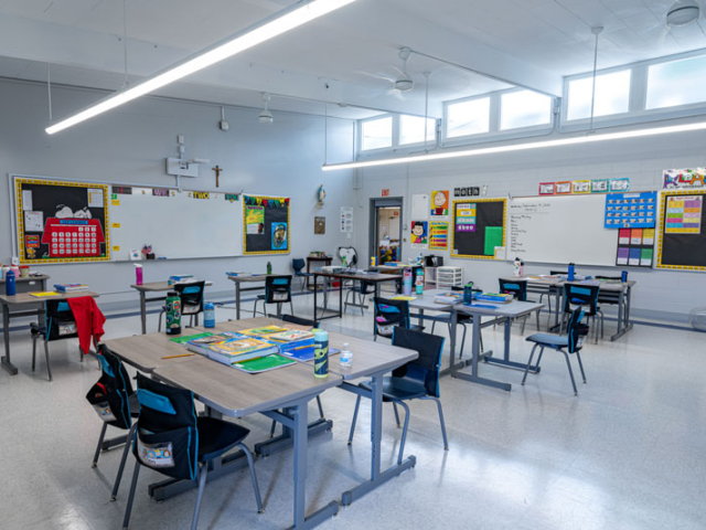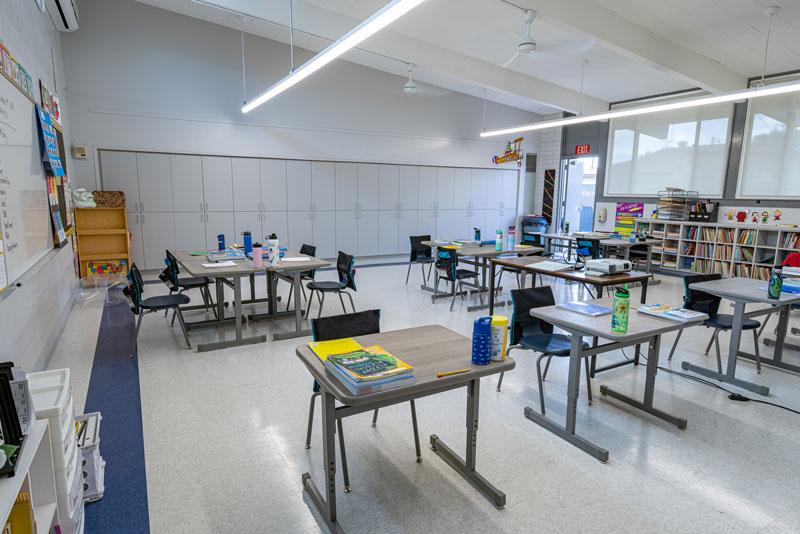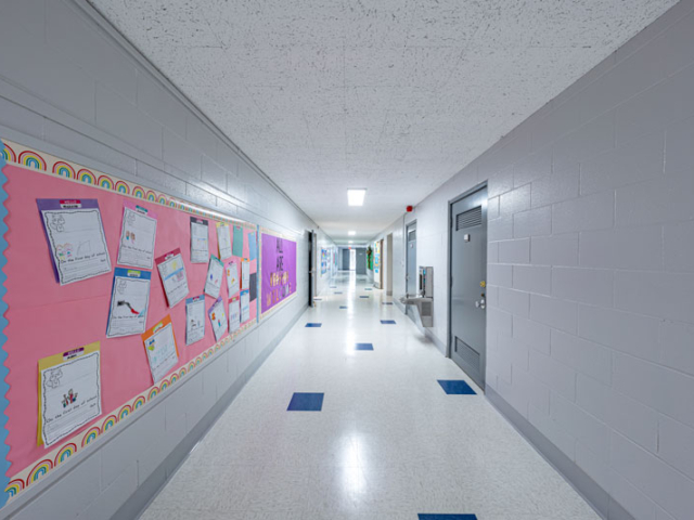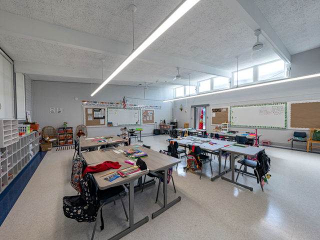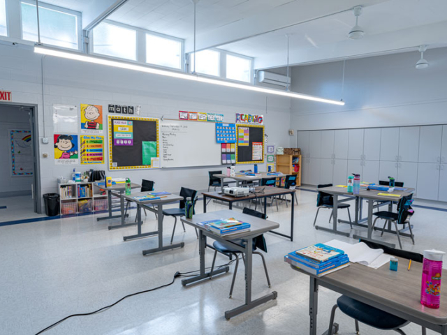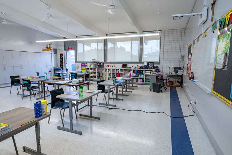 Renovations included exterior paint, new windows, and window shades throughout, painting of offices, hallways and classrooms, new flooring in teacher’s lounge and classrooms, new kitchenette and lighting in teacher’s lounge, new millwork, whiteboards, projectors, lighting and ceiling repairs in the classrooms, new wall and floor tiles, new partitions, urinals, sinks, faucets and accessories in the restrooms and new drinking fountains.