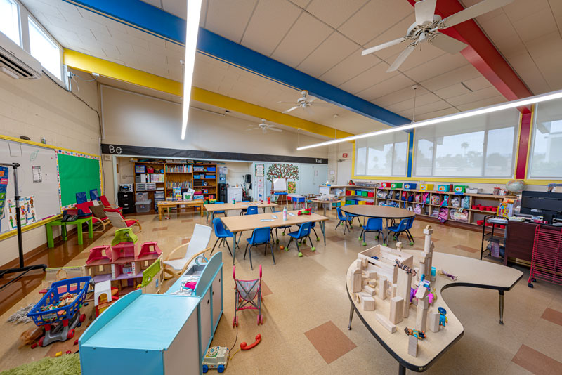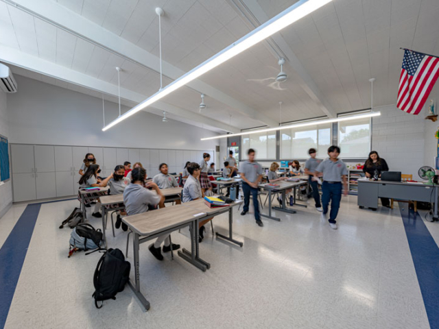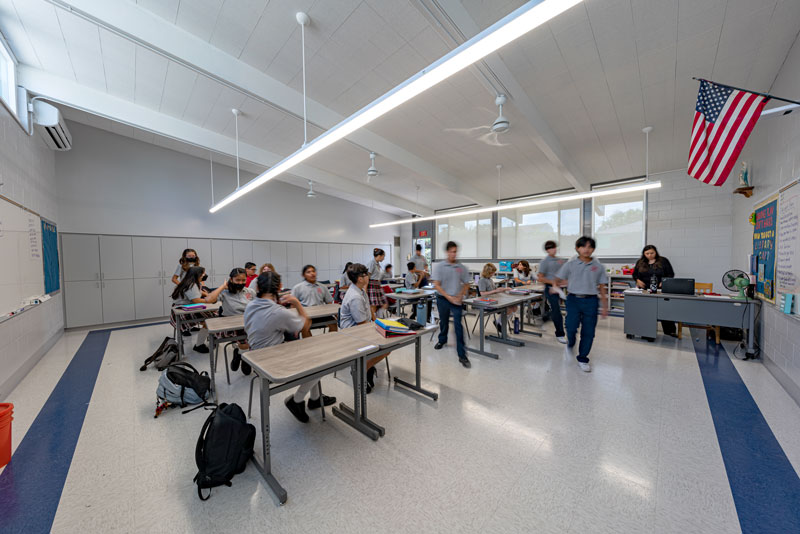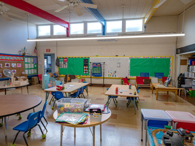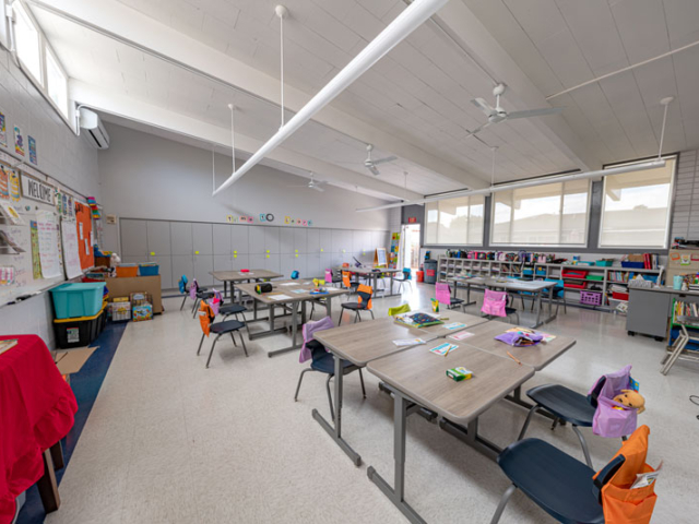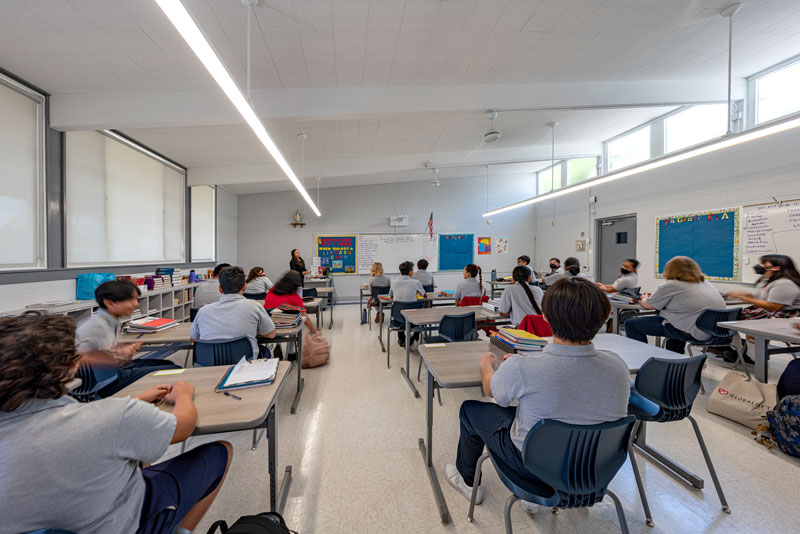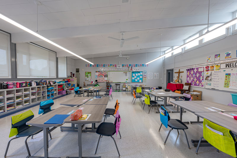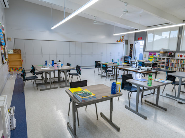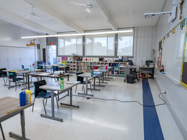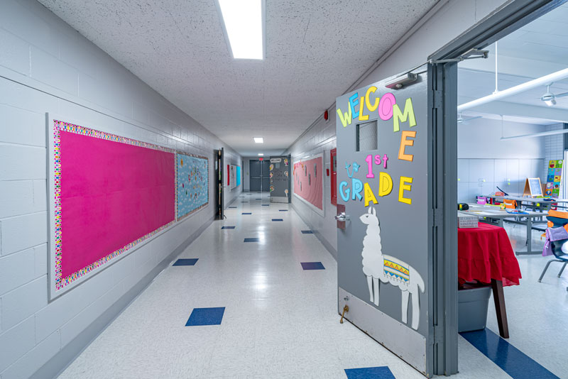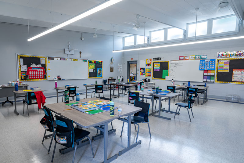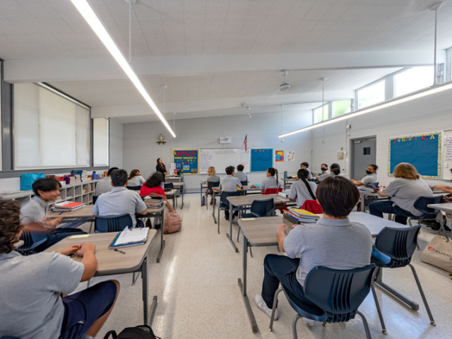 Renovations included exterior paint, new windows, and window shades throughout, painting of offices, hallways and classrooms, new flooring in teacher’s lounge and classrooms, new kitchenette and lighting in teacher’s lounge, new millwork, whiteboards, projectors, lighting and ceiling repairs in the classrooms, new wall and floor tiles, new partitions, urinals, sinks, faucets and accessories in the restrooms and new drinking fountains.