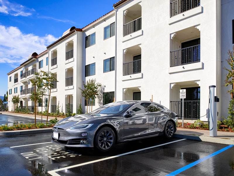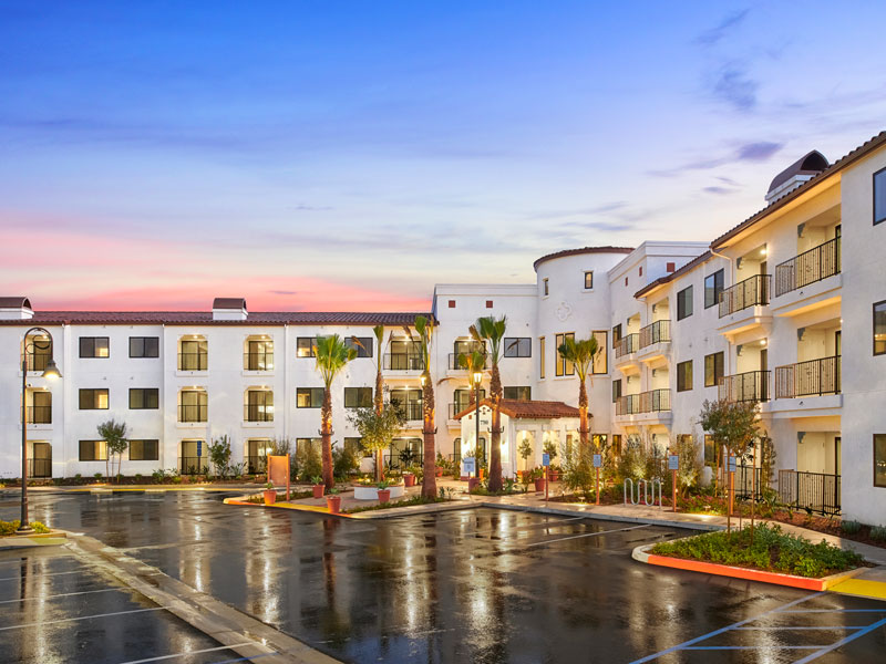 The Spanish style facility consists of five (5) Studios, seventy-one (71) 1-Bedrooms, and twelve (12) 2-Bedroom apartments with separate kitchens, bathrooms, and laundry facilities within each unit; common areas with activity rooms, lounges, fitness room, mail room, offices, and restrooms; exterior areas with built-in pool and spa, BBQ, bocce ball court, extensive landscaping and decorative hardscaping; parking areas with on-site paved parking, car ports, carriage houses, and electric vehicle (EV) charging stations.